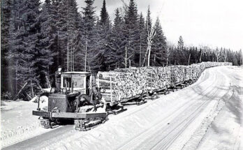 This photo from the mid-1940s shows an International TD-18 crawler tractor pulling over 20 sleighs of pulpwood for the Great Northern Pulp & Paper Company. Based in Millinocket, Maine, about an hour west of the New Brunswick border, the company had been in operation since the early 1900s.